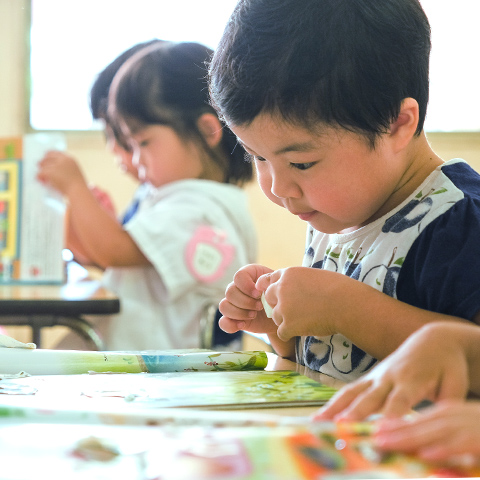 シール遊び・迷路・仲間探し・工作など、発達段階を考慮した教材を選択し、無理なく思考力や手先の巧緻性を養います